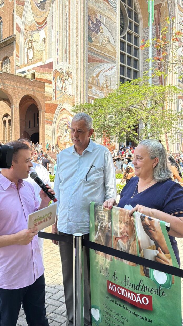 O prefeito de Catalão, Velomar Rios, e a secretária municipal de Promoção e Ação Social, Neusa Rios, concederam entrevista à TV Aparecida, no sábado (22/11), nos jardins do Santuário Nacional de Aparecida, em Aparecida (SP). Eles falaram sobre a experiência do Posto de Atendimento ao Cidadão na Condição de Morador de Rua, inaugurado em agosto deste ano, em Catalão.