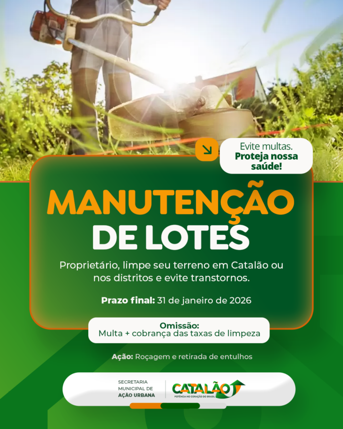 A Prefeitura de Catalão publicou o Edital de Notificação Coletiva nº 0001/2026, que convoca todos os proprietários de terrenos, edificados ou não, a realizarem a limpeza imediata de seus imóveis. O prazo final para o cumprimento da manutenção é o dia 31 de janeiro de 2026.